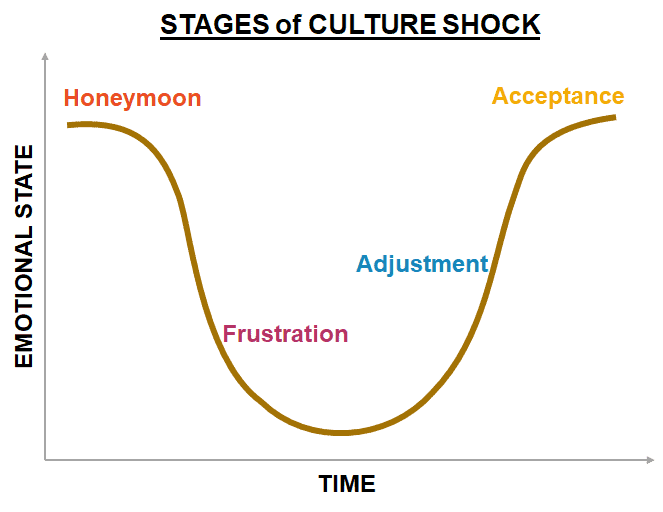 When I worked at an University, I used to give a power point presentation to study abroad students about culture shock to prepare them for the phases of transition people in new cultures often go through. Over a twelve month period, there is often an upside down bell curve with four phases: the honeymoon phase, culture shock, adjustment and acceptance/adaptation. My partner and I reviewed it before moving, so we could recognize symptoms when they start to occur.