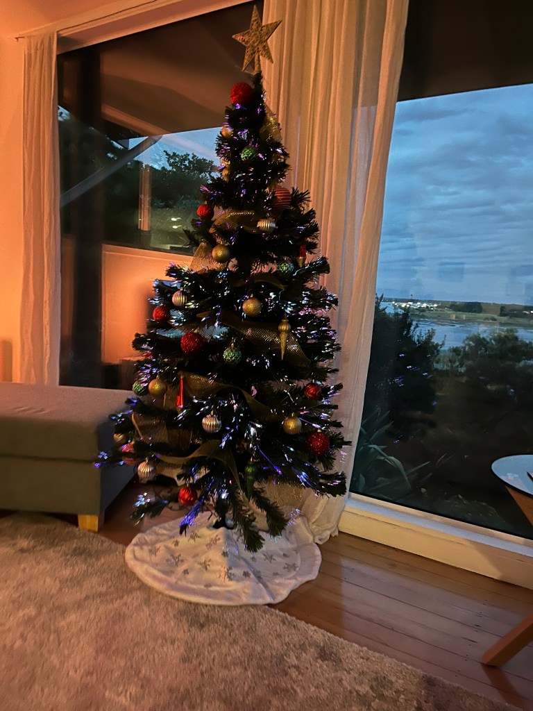We did manage to get a tree this year, which despite the warm weather and sunshine until 9pm does make it feel more like the holidays. Things are more expensive here, so I bought the cheapest fake tree at the hardware store I could (and still be taller than 4′). It has fiber optic lights and is actually quite crooked if you look at it directly. I lovingly refer to it as our who-ville tree. Despite that, it’s ours and it makes the living room cozy. It’s hard to believe it will be our second Christmas here.